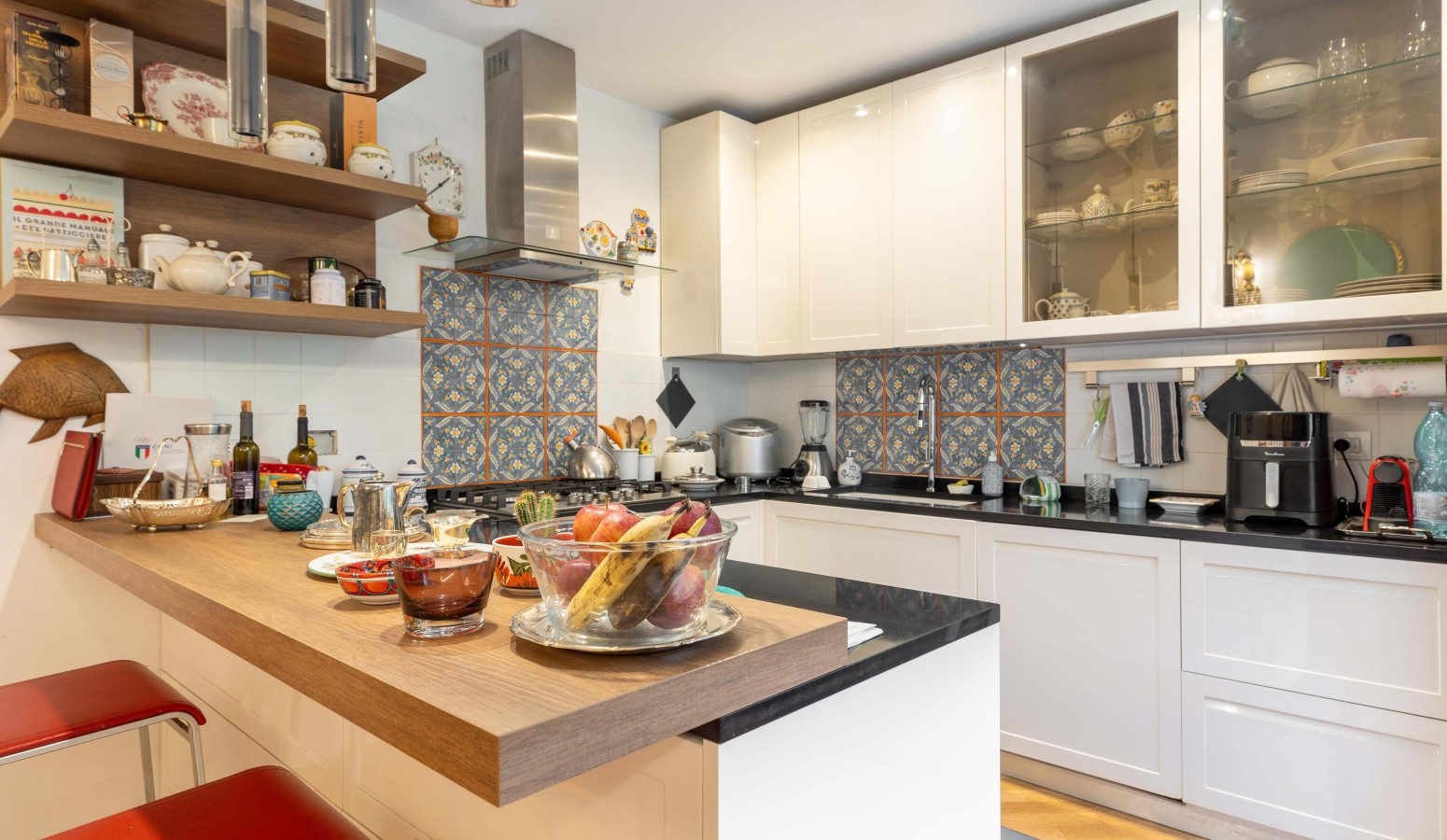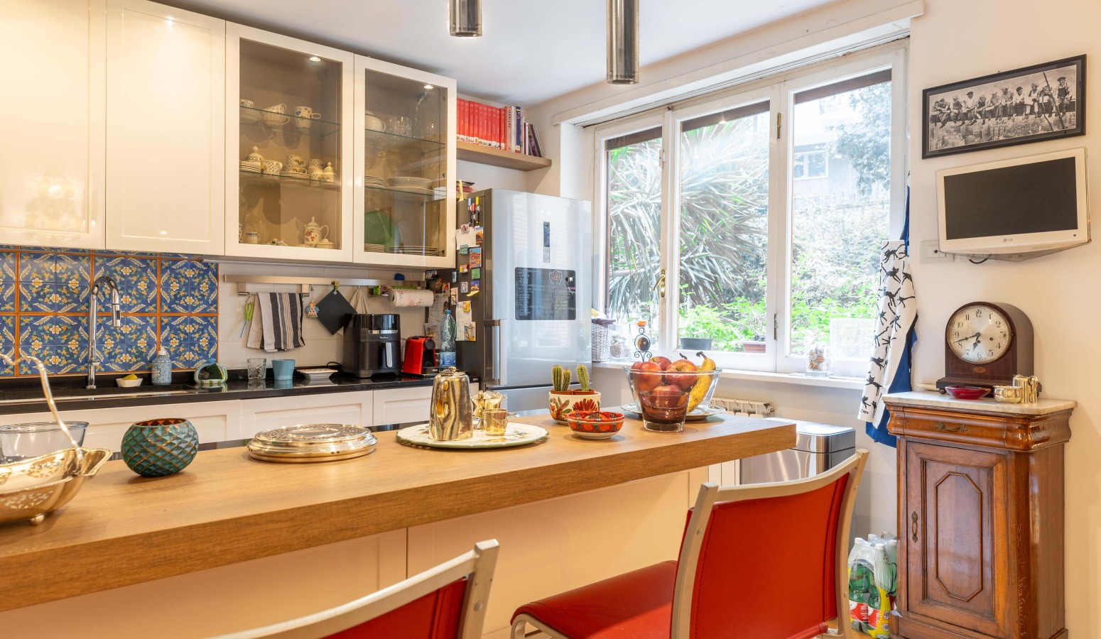 L’appartamento di mq. 185 circa, è composto da: doppio ingresso, ampio salone con cucina a vista, tre camere, tre bagni, studio con cucina attrezzata; tutti gli ambienti della casa affacciano sul grande giardino di pertinenza, che la circonda completamente. Completano la proprietà un posto auto coperto ed una comoda cantina, raggiungibili con l’ascensore.